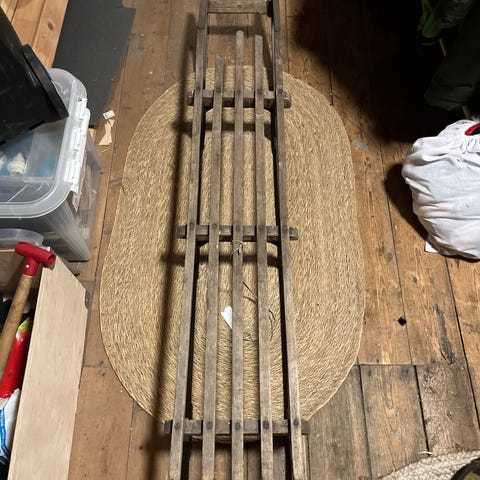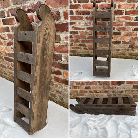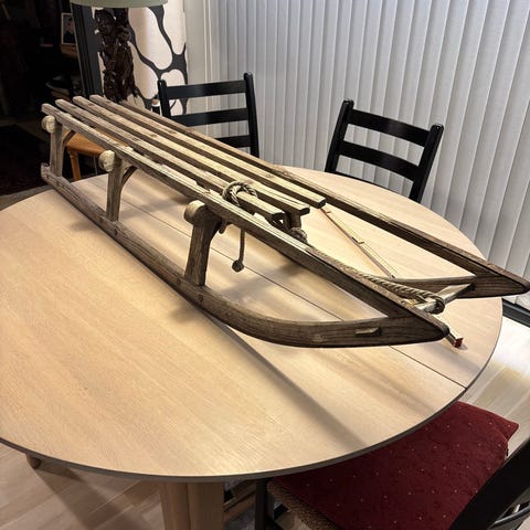 Gammel stor kjelke i tre med tradisjonelt design, tidligere brukt på snø eller is for transport eller til aking.