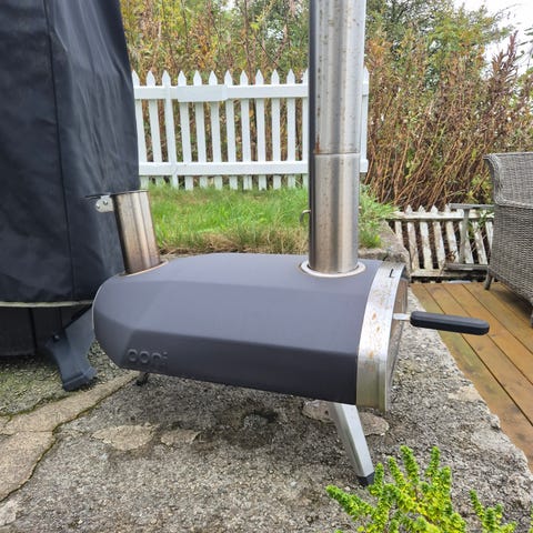 Ooni Koda 16 pizzaovn med svart farge og rustfritt stål ben. Egnet for utendørs bruk, designet for å lage pizza med høy temperatur raskt og effektivt. Følger med pizzaspade