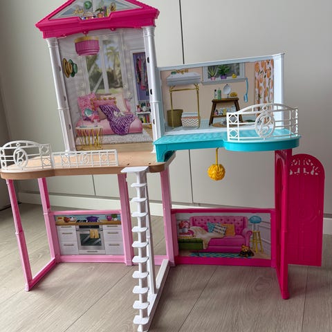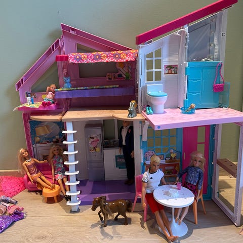 Barbie Malibu House lekehus med flere rom og møbler inkludert. Leke huset har forskjellige etasjer og detaljer som kjøkken, stue, bad og soverom. Passer for barn som liker rollelek og bygging.