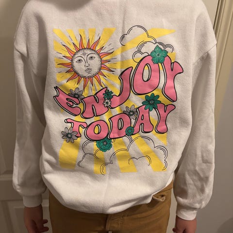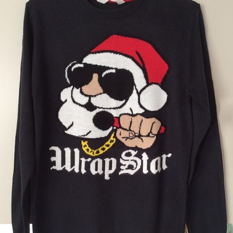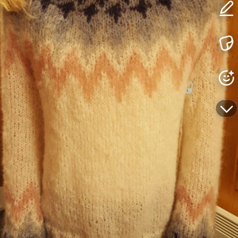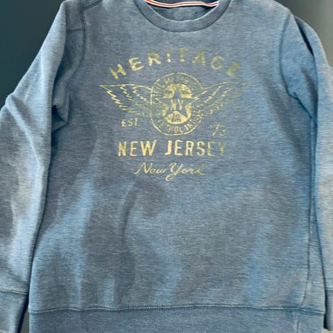 Pent brukt genser fra Planet Heart i polyester og bomull. Jeg synes genseren virker som en 158, men det kommer jo litt an på hvor kort man vil ha den og figuren til den som bruker genseren.