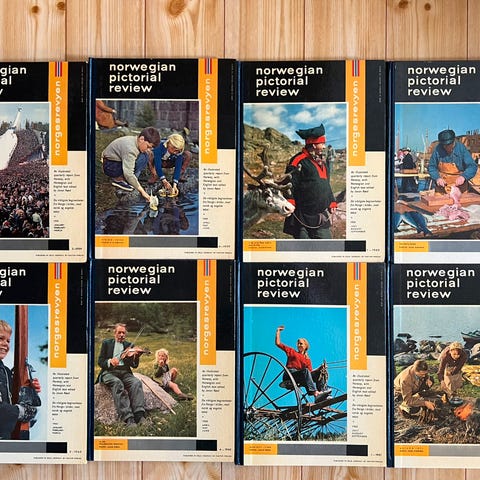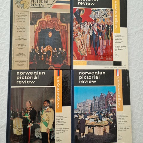 15 bind av bokserien «Norwegian Pictorial Review», også kjent som «Norgesrevyen» med alle viktige hendelser i Norge, med både norsk og engelsk tekst, pent illustrert med fotografier. Bøkene ble utgitt kvartalsvis mellom 1958 og 1985. Jeg selger:
