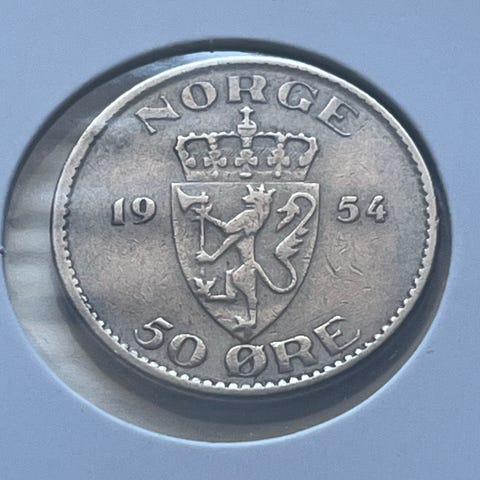 Norsk 50 øre mynt fra 1939 med hull i midten. Mynten har kongekroner og dekorative mønstre. Den er laget av metall og har en rund form med diameter tilpasset 50 øre standard.