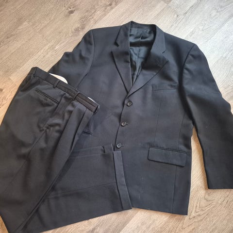 Jakke er i str. 50 regular og bukse er i str. 30/32
