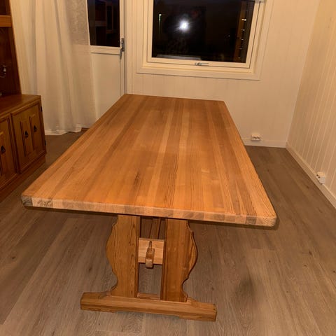 Disse har stått bortglemt og gjemt lenge. Stolrygg er 118 cm, bordplaten er 45x45 cm, bordet er 77 cm høyt.