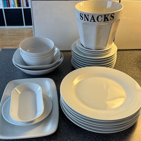 Eschenbach servise i porselen med blå kant. Settet inkluderer 12 middagstallerkener, 3 serveringsfat, 2 sausnebb, 1 serveringsskål med lokk og 2 boller.