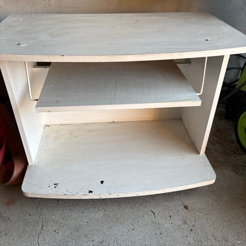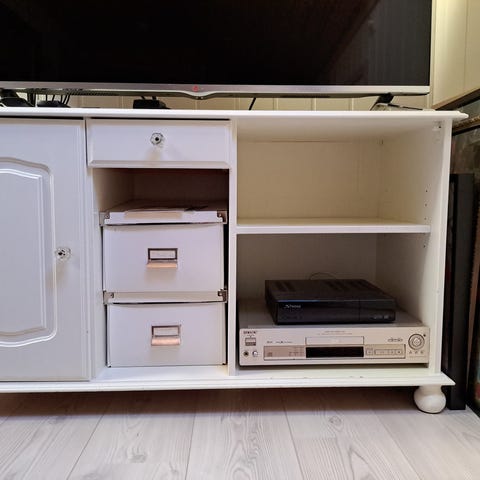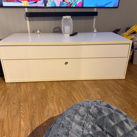 Solid tv benk gis bort. Trenger litt omsorg. Synlige tusj- merker på overflate. Pyntelist som har løsnet (kan lett limes). Må hentes.