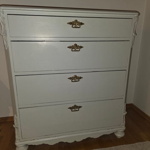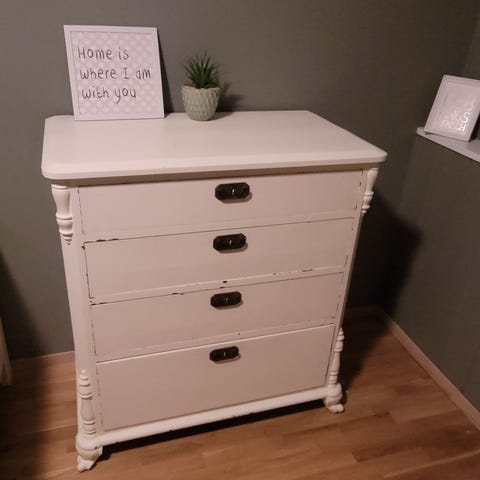 Gammel kommode med tre skuffet som er malt og byttet knotter på for å passe bedre inn på barnerom,