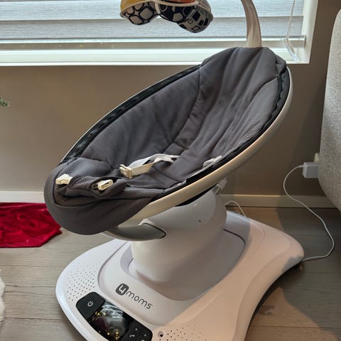 4moms barnestol med vuggefunksjon, grå farge og integrerte leker. Stolen har sikkerhetssele og nettingbeskyttelse for komfort og trygghet.