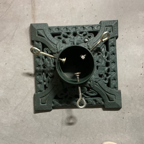 Pent brukt juletrefot med 3 liters vannbeholder. Wirelås. Takler inntil 11 cm diameter trestamme og 220 cm høyde.