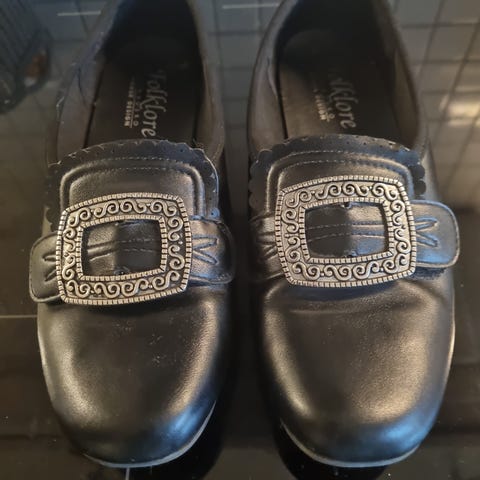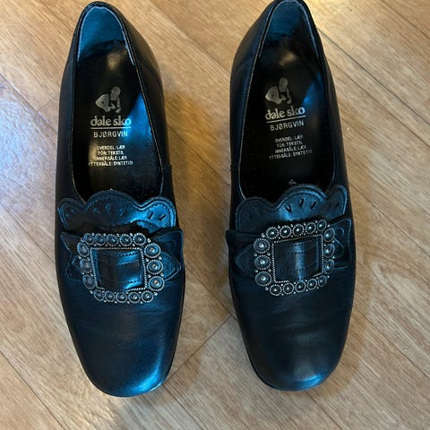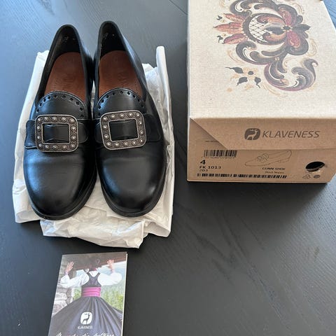Klaveness Britt, håndsydde kvalitets bunadsko i sort kalveskinn.. Mykt tekstilfor. Skinn innersåle. Stabil hel- og tåkappe.