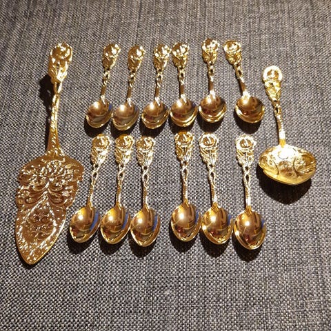 Jeg vurderer å selge mitt nydelige bestikk for 14 personer til selskaper, kaffekos og dessert. Dette er kjøpt hos gullsmed i Fredrikstad for 20-25 år siden, men kan ikke se at det er ekte gull i emaljen. Settet er i Stainless Steel, gullfarget, med nydelig innlagt perlemor-mønster. Det følger med eske til kakespaden. Alt er i nydelig stand.