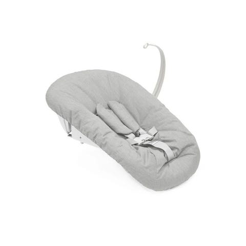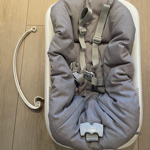Kjempefint nyfødtsete fra Stokke til Tripp Trapp stol med grått trekk og lekebøyle. Meget pent brukt, ingen merker eller synlig slitasje.