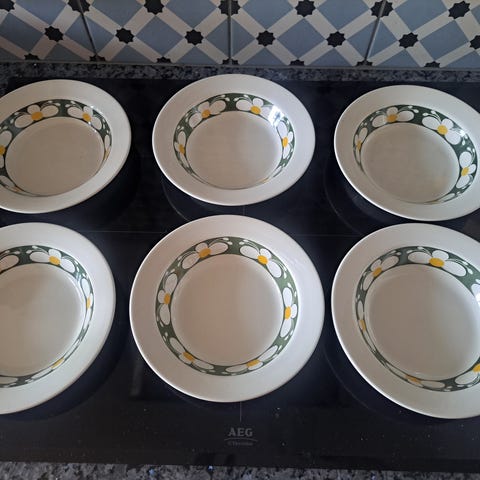 Meget pent retro servise til 12 personer, herlige Nora fra Stavanger Flint. Selges samlet for 2.500 kroner. Dette er et veldig godt kjøp! 💚