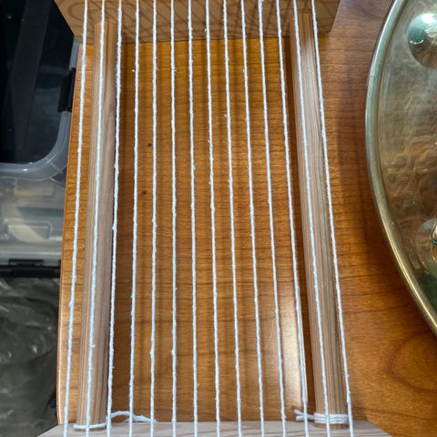 Ukjent vevramme i tre med flerfarget vev. Brukes til håndveving av tekstiler. Passer for hobby, kunst og håndverk for barn.