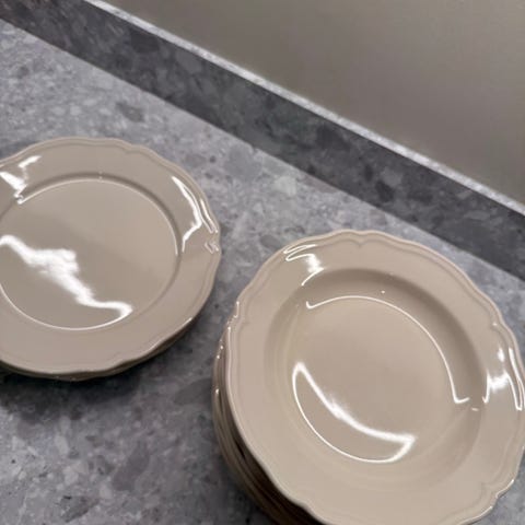 Selger IKEA hvite tallerkener med dekorativt mønster langs kante. Totalt 9 stk hvorav: