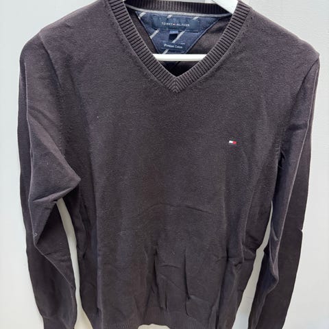 Tommy Hilfiger genser i størrelse S for herre. Genseren er grå og laget av bomull. Den har en enkel, klassisk design med rund hals og ribbestrikkede kanter. Passer til hverdagsbruk og lag-på-lag antrekk.