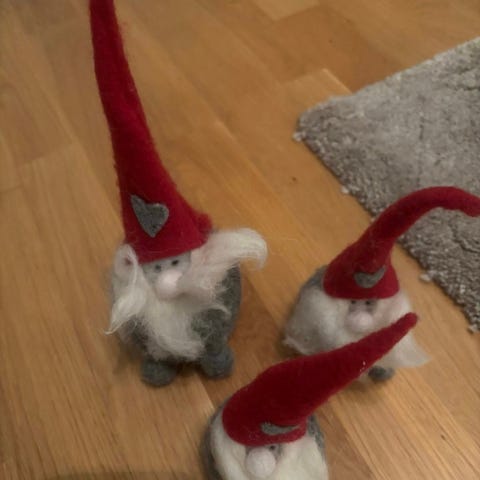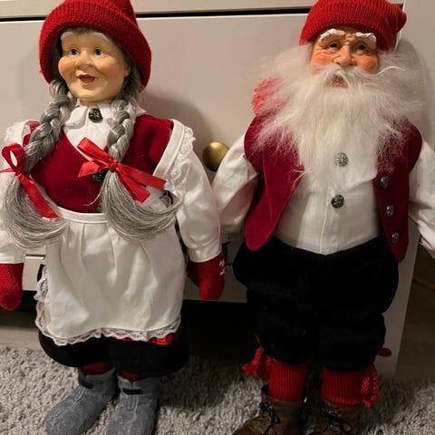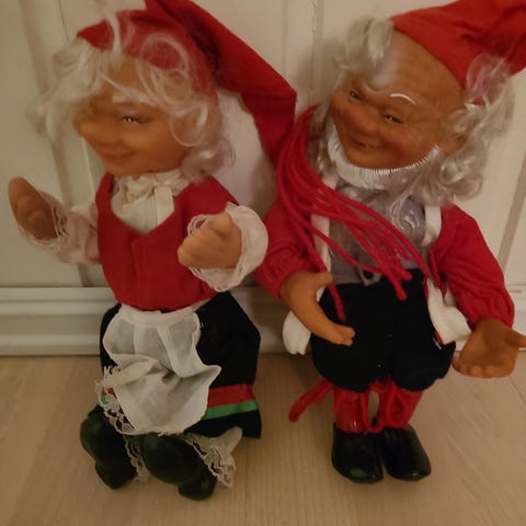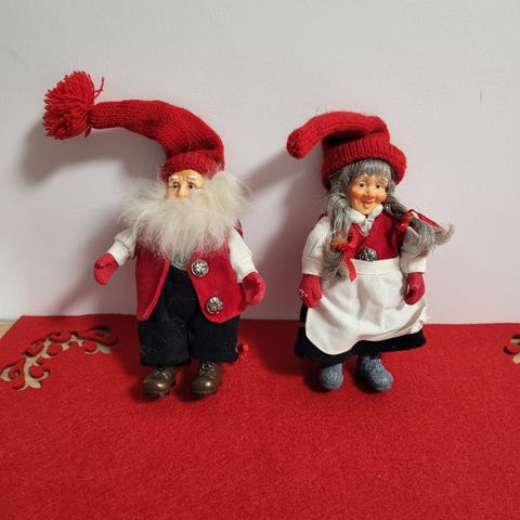 To julenisser med armar og bein som går at bevege. To mindre. Selges samlet.