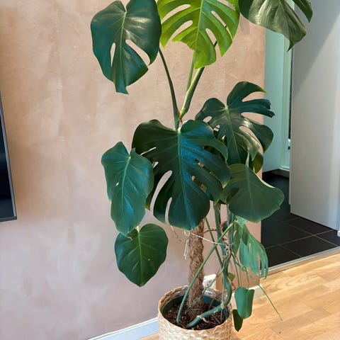 Min fine monstera har vokst seg for stor og trenger et nytt hjem. Terracotta potten med fat følger med. Det er perlitt blandet inn i jorden for god fukt regulering.