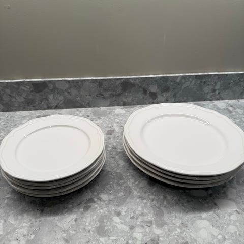Fine og pent brukte tallerkener fra IKEA med dekorative kanter, i offwhite/beige farge. Brukt, men med svært lite bruksmerker.