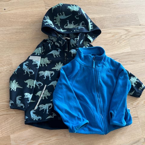 Selger disse 2 fleecene☺️ den grønne er i størrelse 2-3 år (98), og den blå er i størrelsen 3 år. Ved den blå er det skrevet navn inni med tusj, se siste bilde. I god stand🤩