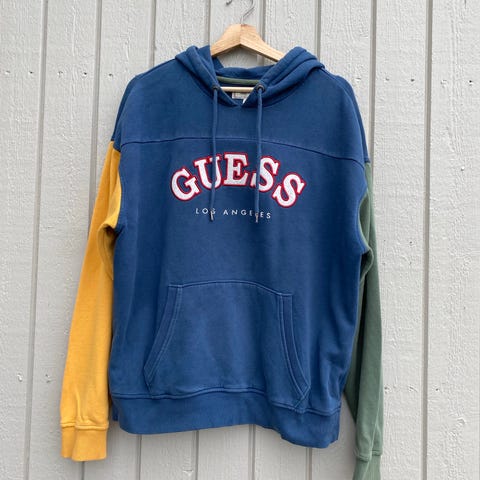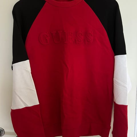 GUESS genser i størrelse M, blå farge og laget av bomull. Genseren har en halv glidelås og dekorative hvite linjer med GUESS-logo på brystet.