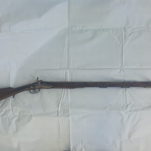 Kruthornet har bruksslitasje og merker, som vist på bildene, noe som gir det autentisk patina og karakter. Messingdelene viser naturlig aldring, og hornet har en fin, jevn form.