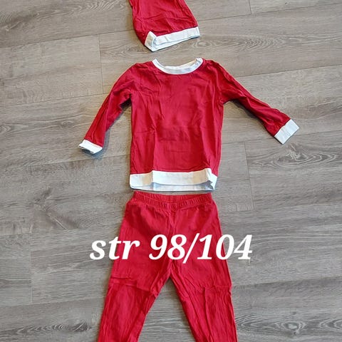 Nissekostyme for unisex bestående av rød og hvit jakke med belte, bukse med hvite kanter, rødt nisselue med hvit dusk, hvitt krøllete skjegg og svarte støvler. Materiale i myk tekstil med dekorative hvite kanter.