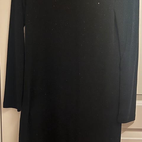 Ikke brukt fest kjole i fargen mørk brun med glitter tråder i gull. Kjolen er i stretch materiale så den passer noen i størrelse S-L . Veldig fin glitter effekt i kjolen. Mye finere i virkeligheten en bildene klarer å få frem :)