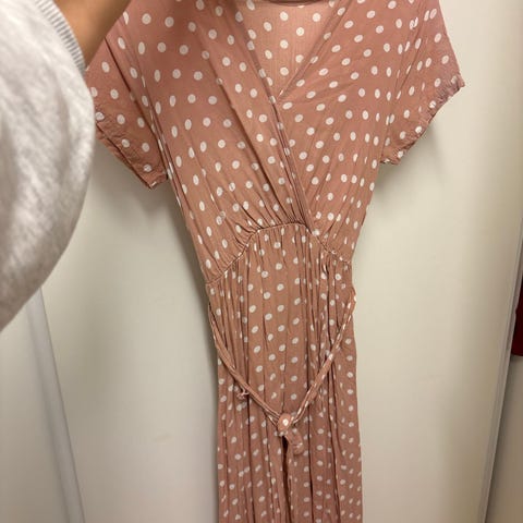 Nydelig rød kjole med hvite polkadot prikker. Wrap kjole med åpning hele veien. Knyting i livet. Sitter helt nydelig på og vil passe alt fra str. XS, S, M og L, vil jeg tro. Litt tynt og gjennomsiktig stoff, jeg har kun brukt den med en hvit singlet under. Brukt kun 2-3 ganger.