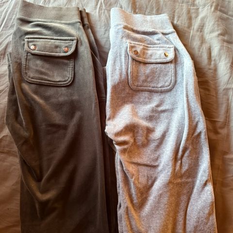 Juicy Couture joggebukser i størrelse XXS og XS, laget av brun og blå fløyel. Designet for kvinner, disse bukser har en komfortabel passform og lommer foran og bak. Selges samlet for 600 eller 350 per stk.