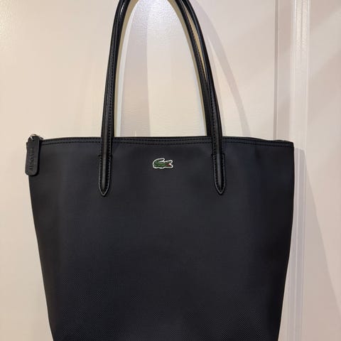 Den har en elegant blåfarge med ikonisk Lacoste-logo på utsiden. Interiøret er friskt og lekkert i grønt og hvitt, som gir vesken et eksklusivt preg ✨