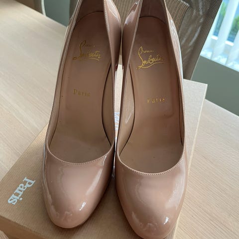 Selger disse nydelige Louboutin-pumpsene i nude patent. De er svært lite brukt, og både lakk og hæl er uten riper eller slitasje. Røde sålen har kun litt normal bruksmerke (se bilde), ellers ser skoene nesten nye ut.