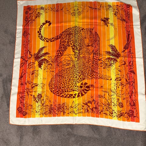 Hermès silkesjal i blå farge laget av 100% silke. Sjalet har et mønster med vingede hester. Årets modell, vanskelig å få tak i. Jeg kjøpte det i sommer hos Hermes Oslo. Hadde veldig lyst på det, men fargen er for sterk for meg. Rakk ikke å bruke det enda. Kvitteringen og lappen følger med. Kan pakke det i esken med bånd som gave. Poser har jeg også å legge ved.