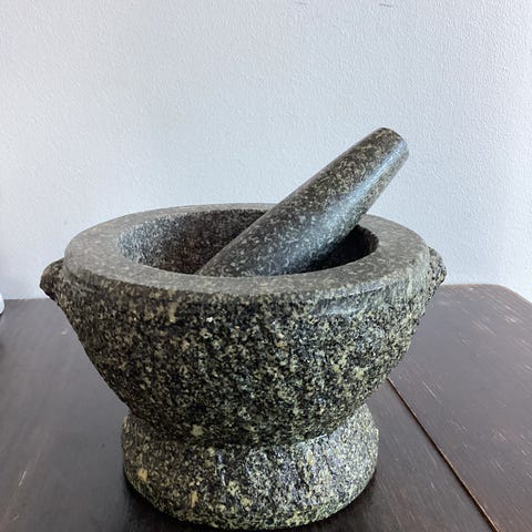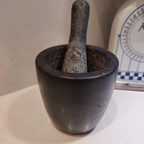 Selger en pent brukt morter med støter, antageligvis av merket Jamie Oliver.