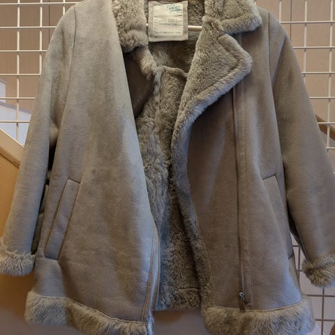 Zara fuskepelsjakke for barn i størrelse 164, designet for jenter. Jakken er beige og laget av fuskepelsmateriale, og har hette og glidelås foran.