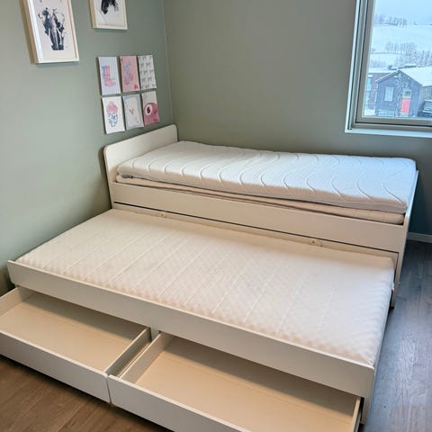Hadde hund det første året vi hadde senga, derav noen merker på overmadrass og et par på rammemadrass.