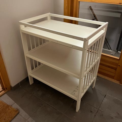 Babybjörn Stellebord for barn i grått. Stellebordet har en sammenleggbar ramme i metall og et grått stoff som overflate. Designet for enkel bruk og oppbevaring, egnet for stell av barn.