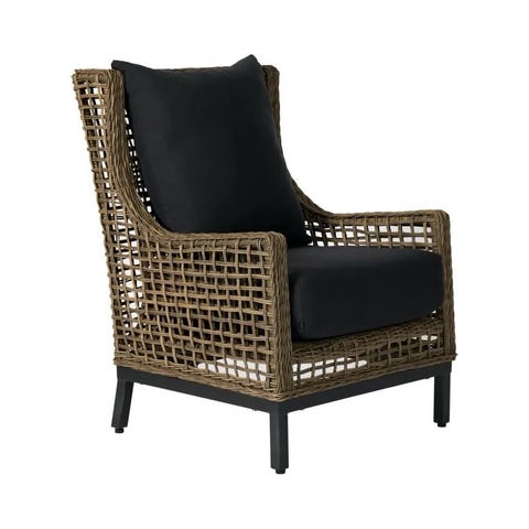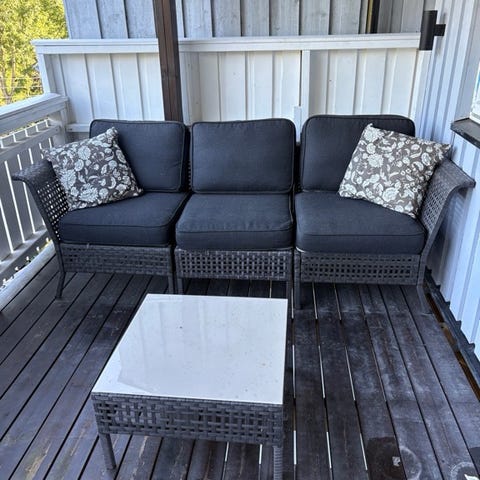 Settet inkluderer en hjørnesofa med puter og et lite bord med glassplate.