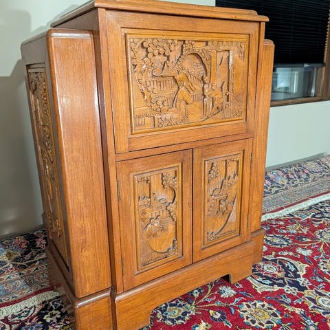 Kisten er solid og hel, med originale jernbeslag, hengsler og lås, og har ikke vært restaurert eller overmalt. Naturlig slitasje etter alder gir den et genuint og historisk uttrykk.