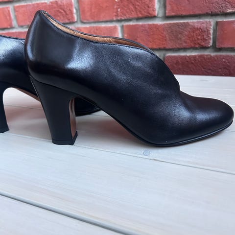 Elegant og feminin pensko i sort skinn fra hæl til tupp. Til og med spennen er dekket i skinn. Avrundet tupp og stødig hæl. Sko som legges merke til - og det elsker vi jo.