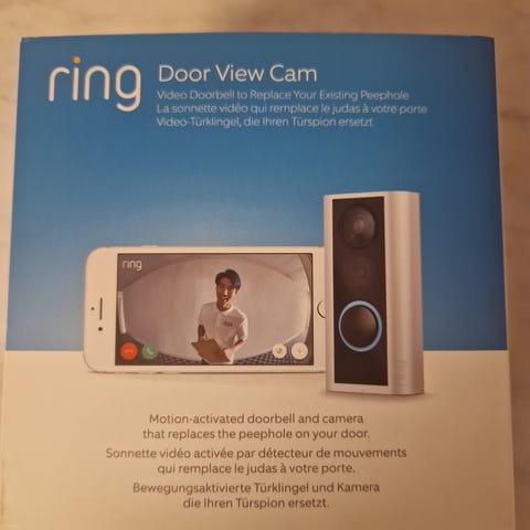 Ring Video Doorbell dørklokke i svart farge. Enhet for montering ved inngangsdør med innebygd kamera og knapp for dørklokke.