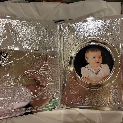Ny og uåpnet barneramme med bamse, sølvfarget.