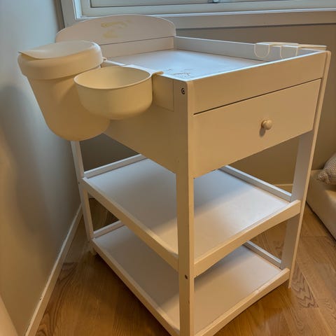 JLY stellebord barn møbel i grå farge. Laget for praktisk bruk ved bleieskift og stell av barn. Har to nivåer for oppbevaring av nødvendige ting.