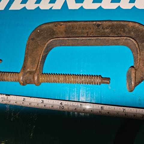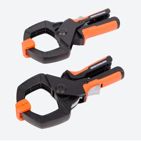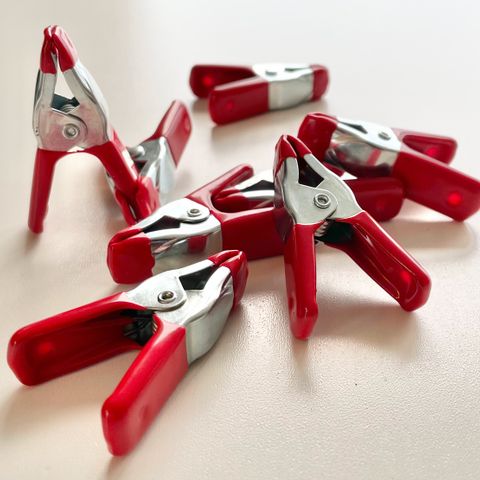 Dette er Klemmsia treklemmer, som er kjent for sin lette vekt, raske handling og brukervennlighet. De er laget av hvitbøk med en galvanisert stålskinne og har korkfôrede klemflater for å unngå trykkmerker på arbeidsstykket.
