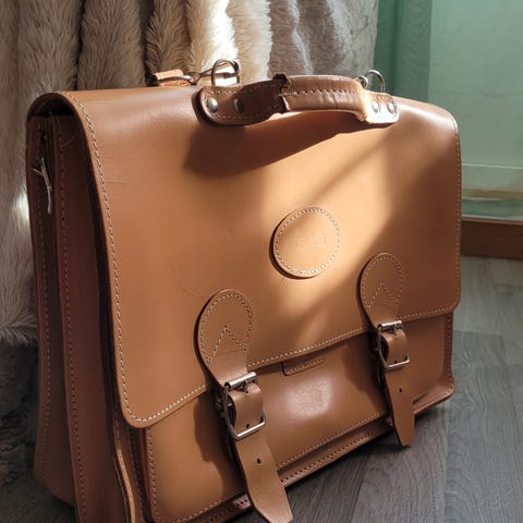 Lumi lær unisex koffert med lærdetaljer og solid konstruksjon. Egnet for oppbevaring av klær og personlige eiendeler. Ingen vond lukt eller fukt i denne. Fra 50-tallet. Har håndtak for bæring og metallbeslag. En innfestingsreim mangler og et beslag må smøres for å holde seg lukket.