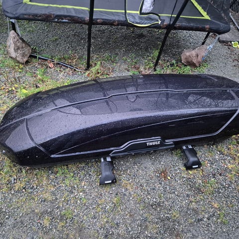 Stor og svart Thule takboks. Enkel å montere, for damer også 😉