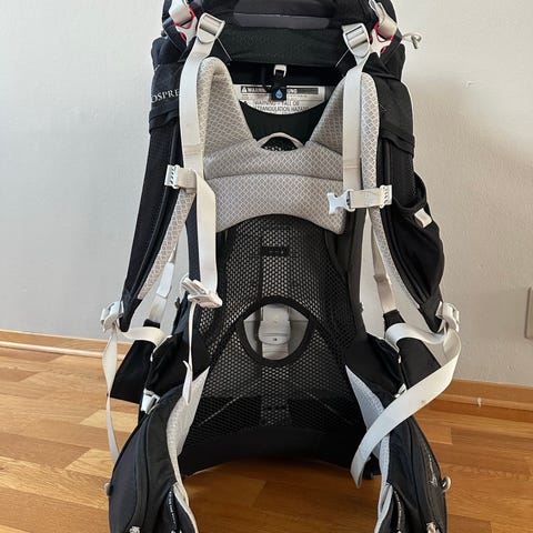Osprey Poco plus bæremeis med soltrekk, regntrekk. Praktiske oppbevaringslommer.