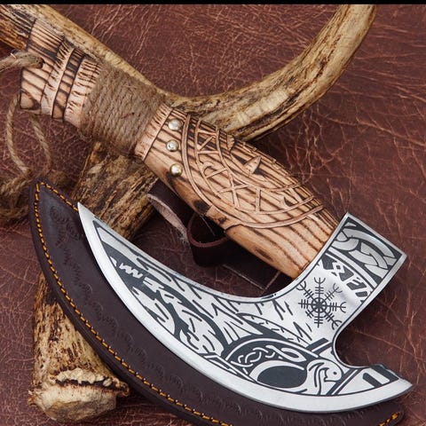 Håndlaget Pizzaøks for salg. Hver og en øks er unik siden skaftsammensettninger, utforming og materialer som brukes varierer. Bruker også materialer av god kvalitet. Øks kan brukes både som jakt, på kjøkkenet . Det kan også være en «eksklusiv» gave til en som har «alt». øks leveres ferdig slipt.