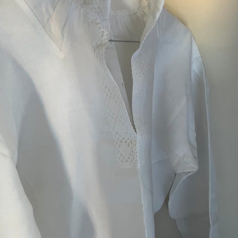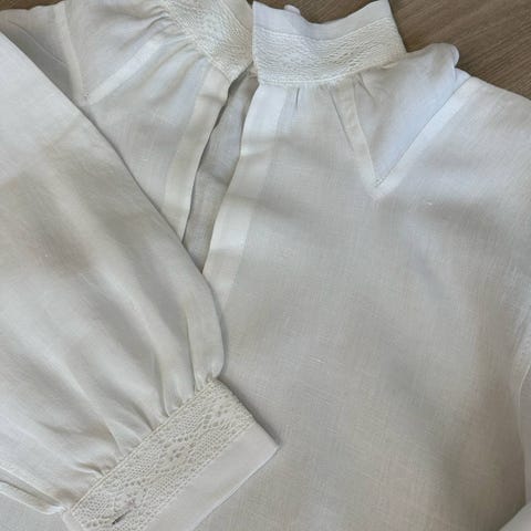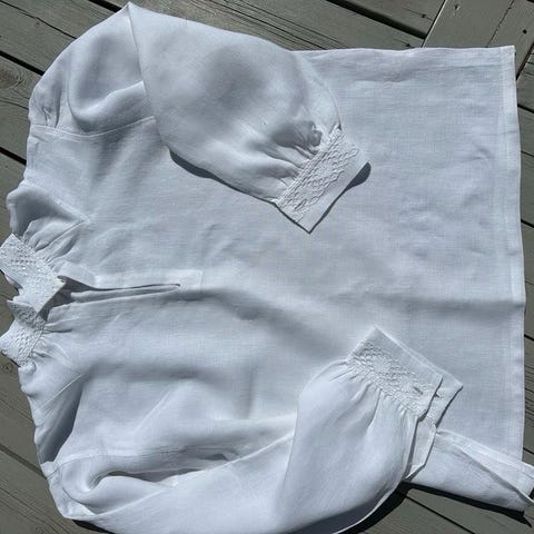 Bunad kjørte i linn størrelse 40/42 de har en liten reparasjon se bilde. Lende 41 cm bredde 51 cm( rund 102 cm) arm fra nakken 70 cm rund hals 38 cm.