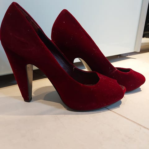 Veldig stilige rødrutete plattform pumps med to stropper i størrelse 40. True to size. Kjøpt i 2012. De er komfortable på og jeg liker dem godt, men selger fordi de blir stående og jeg aldri får brukt dem. God kvalitet og i topp stand.